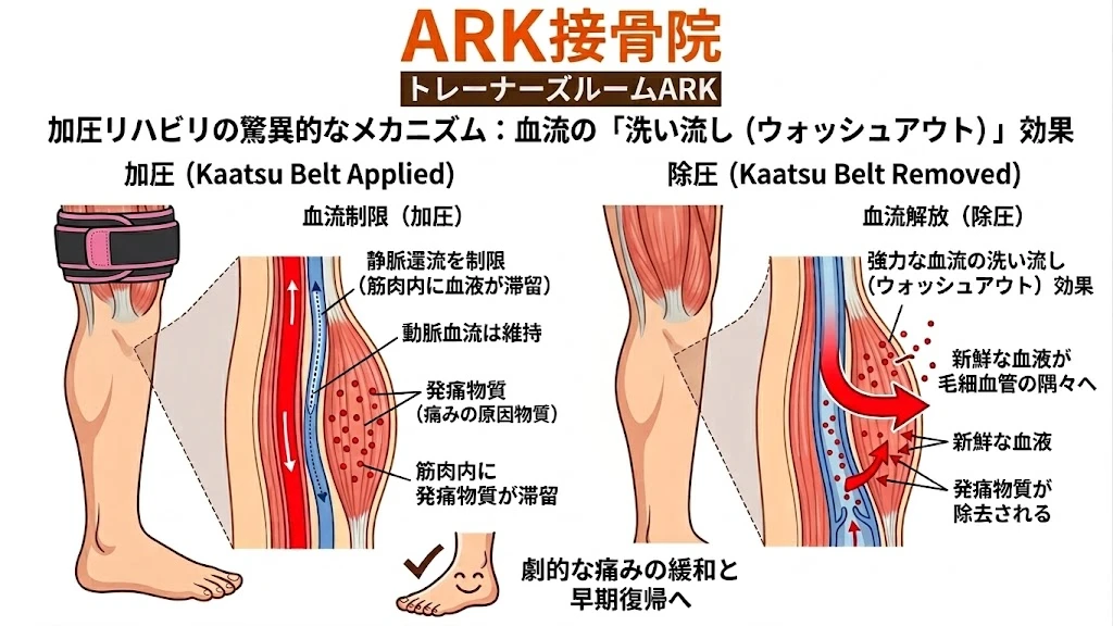 そこでARK接骨院が最大の強みとして掲げているのが、「休ませない治療」と「早期復帰(Return to Play)」の実現です。当院では、単に痛みを取るだけでなく、ケガをする前以上のパフォーマンスで競技に復帰していただくことをゴールとしています。その圧倒的な早期復帰を実現するための強力な武器であり、科学的根拠(エビデンス)に裏付けられた最新の治療ツールが「加圧リハビリテーション」です。